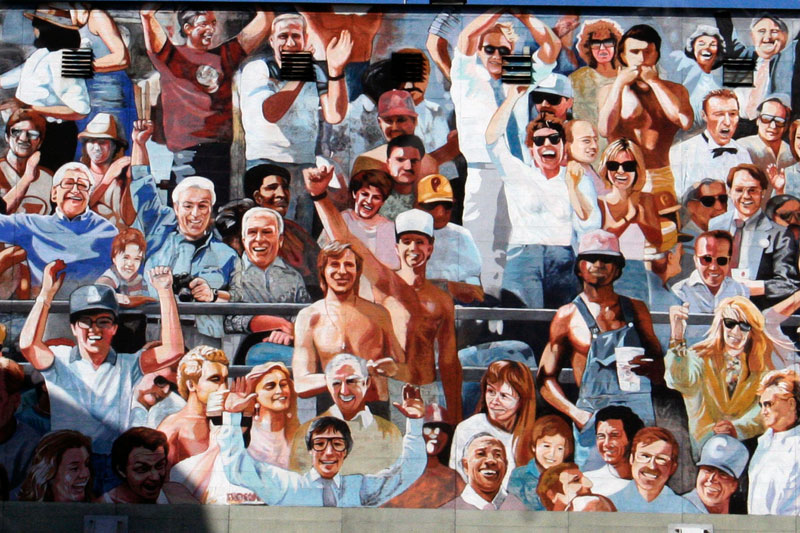 I looked around at the vastness of the empty parking lot and took a deep breath of the fresh cool morning air. My gut tightened with anticipation for what lie ahead. A hand painted mural on the wall caught my attention. A 2 dimensional picture of a large cheering crowd in the grandstands looked back at me. The multi-colored audience was painted in flat grey brown, fleshy tones with splashes of green, white, blue and red.